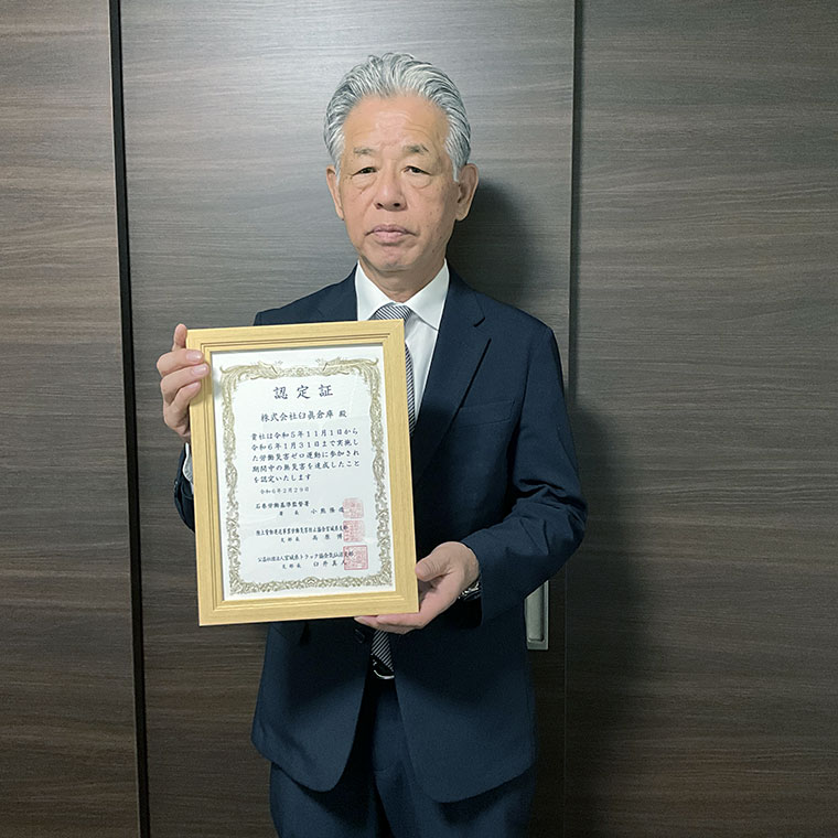労働災害ゼロ運動期間中 無災害達成認定証…